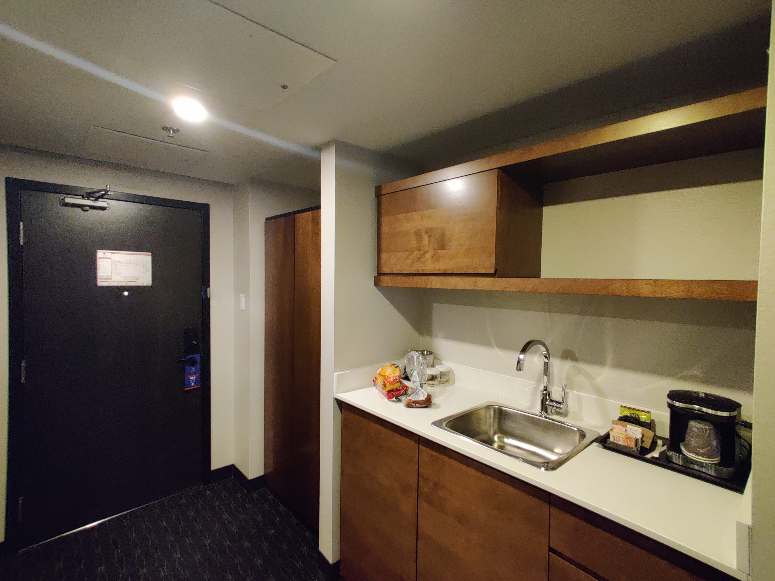 Nous avons été accueilli avec un grand sourire par la personne présente à la réception. Grâce au statut Hilton Gold, nous avons été surclassé d’une suite 2 lits queen vers une suite studio avec un lit king.