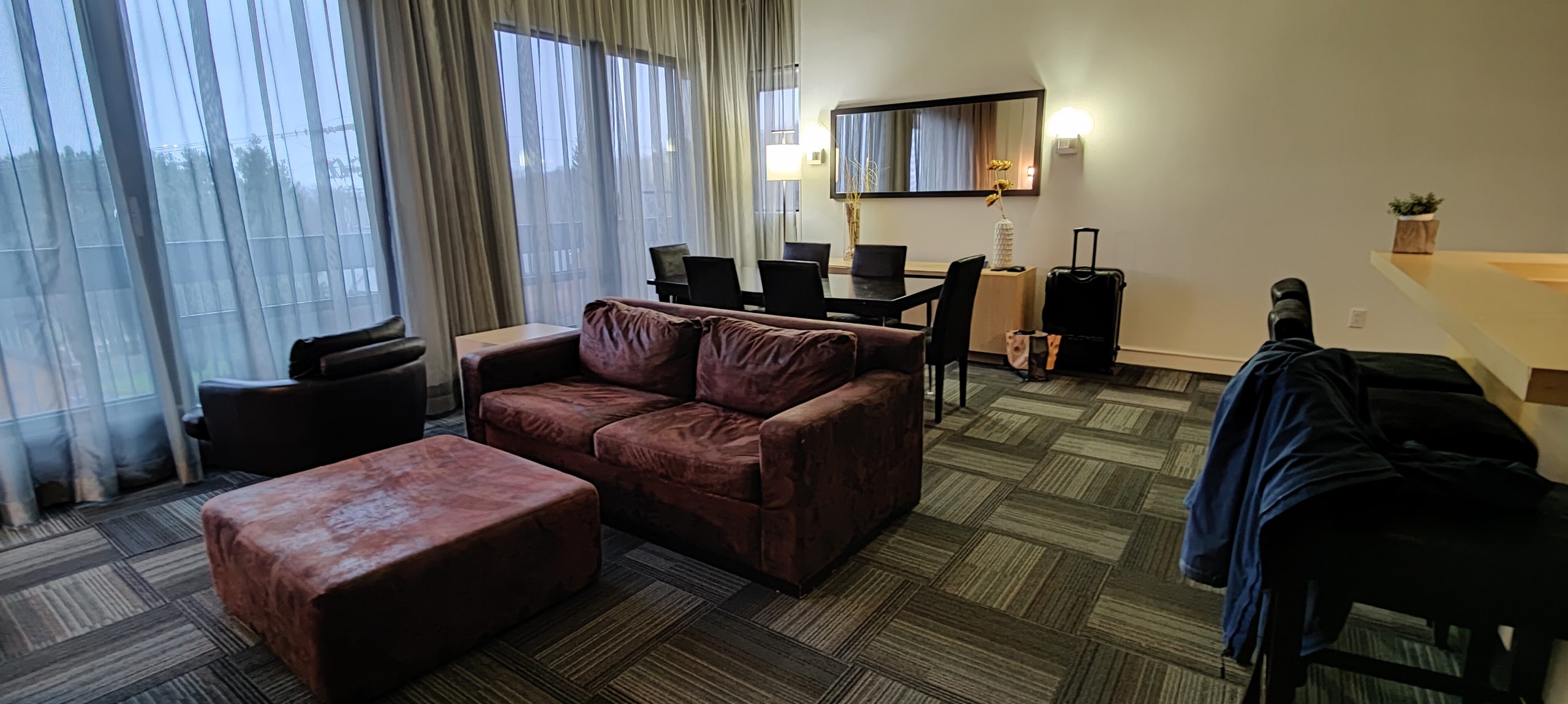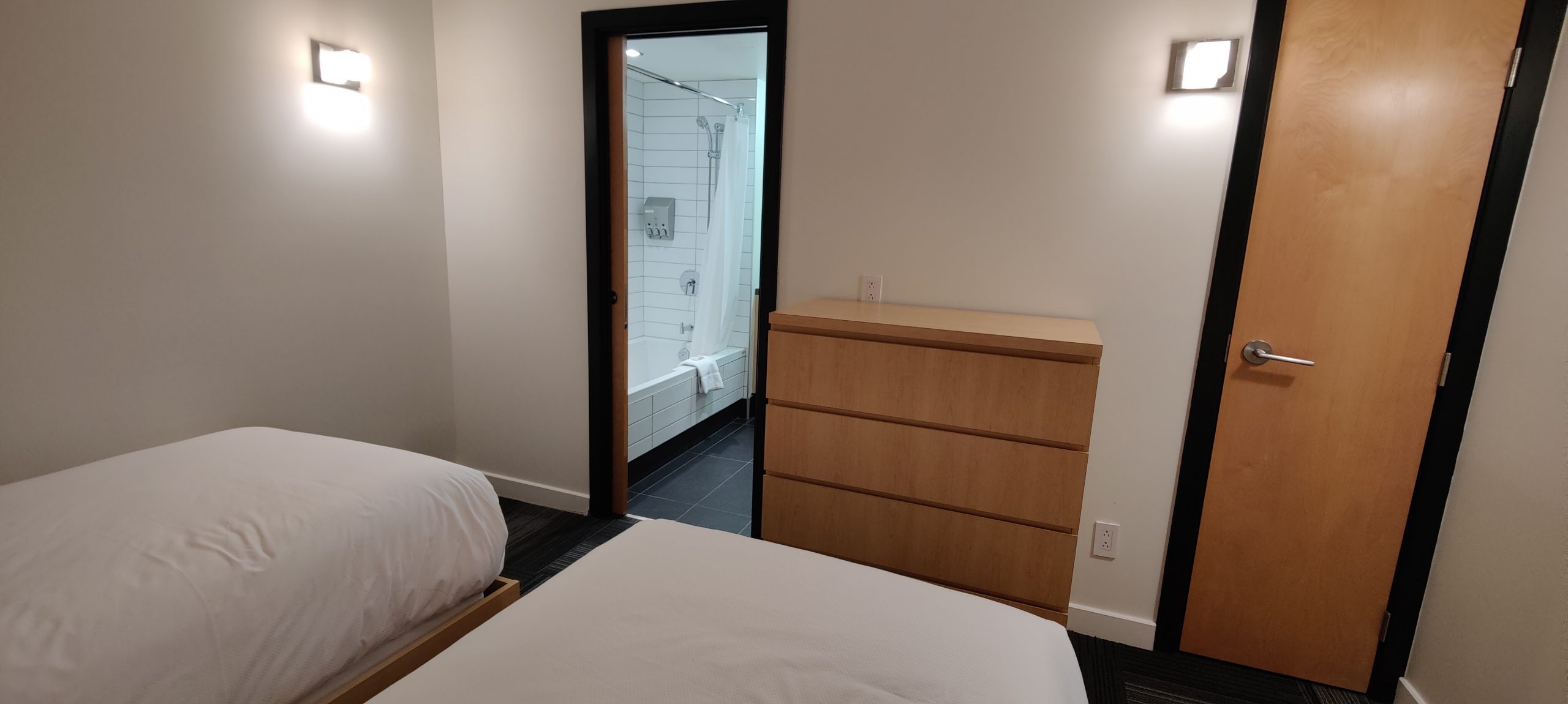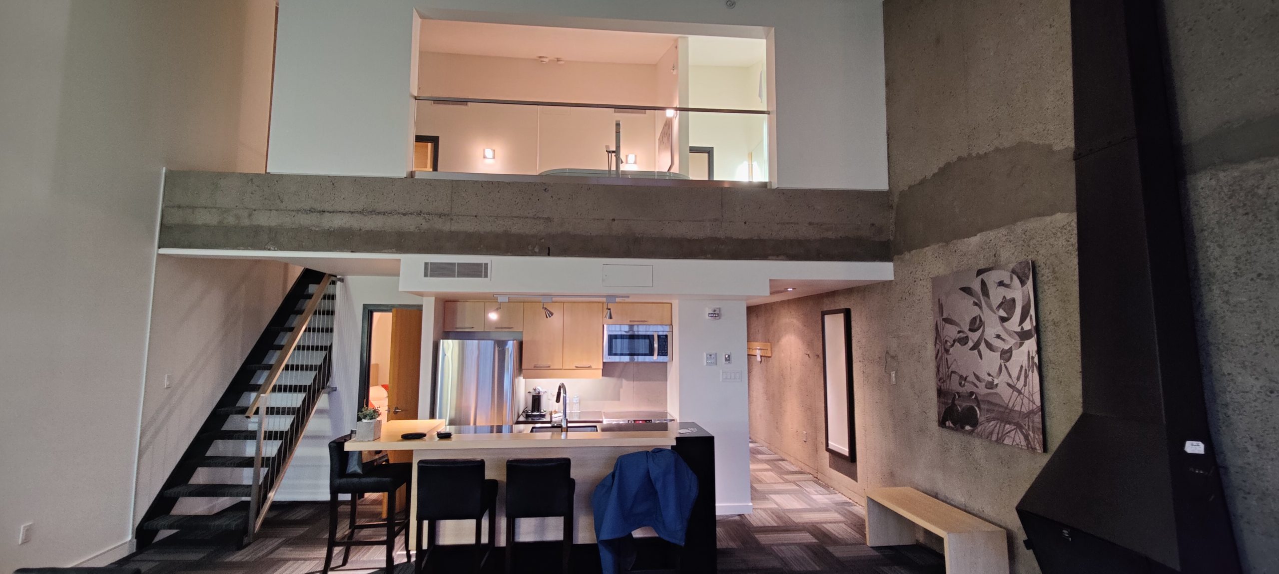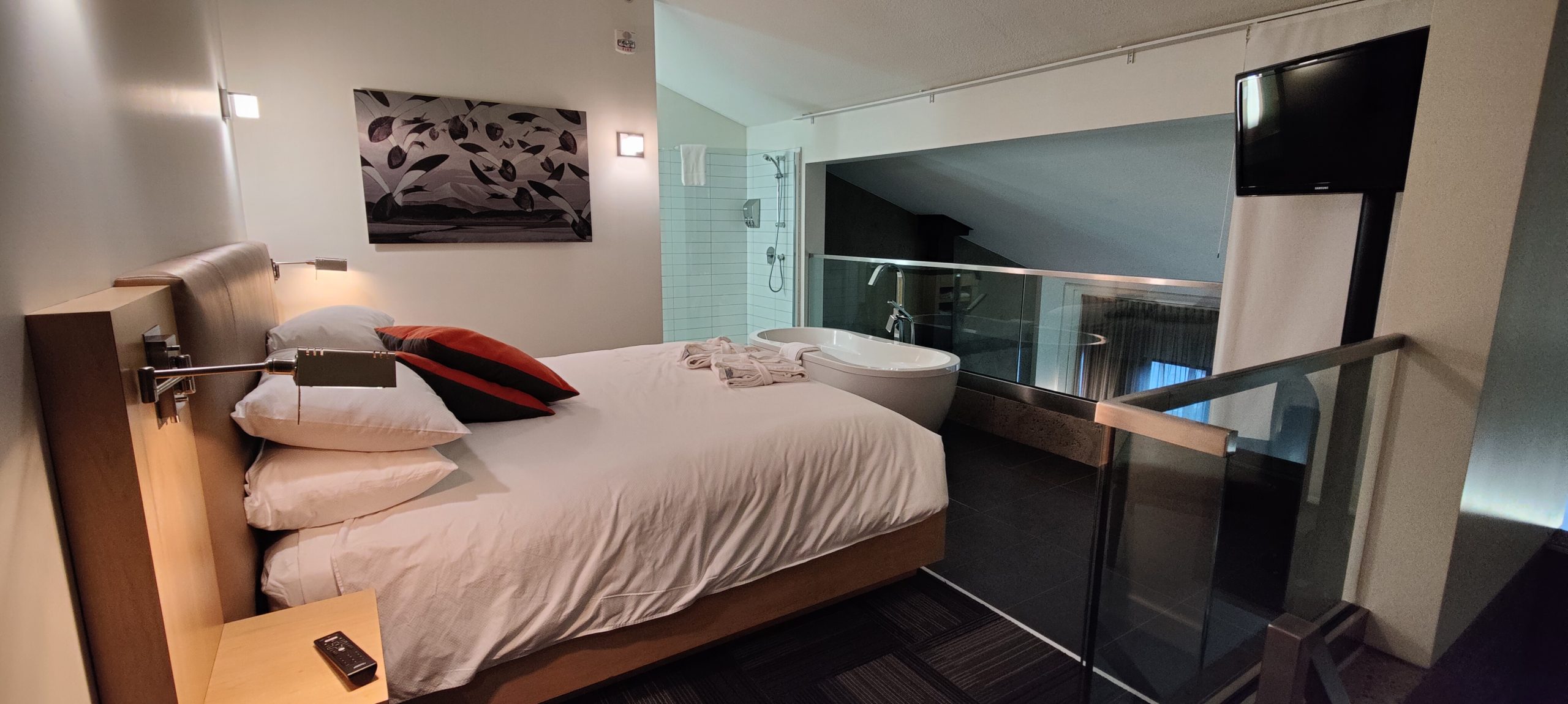 Initialement dans une chambre classique avec deux lits Queen, nous avons demandé un surclassement vers une suite. Nous avons eu l’énorme chance que l’hôtel n’était pas complet à cette période de l’année (la saison hivernale n’ayant pas encore commencée au moment de notre visite). Nous avons donc pu profiter d’un surclassement dans un penthouse.