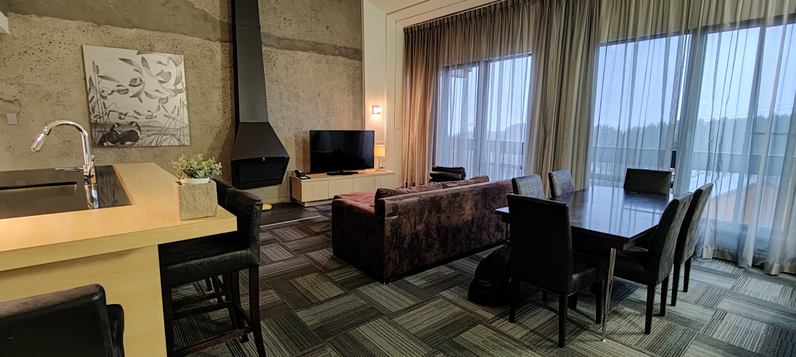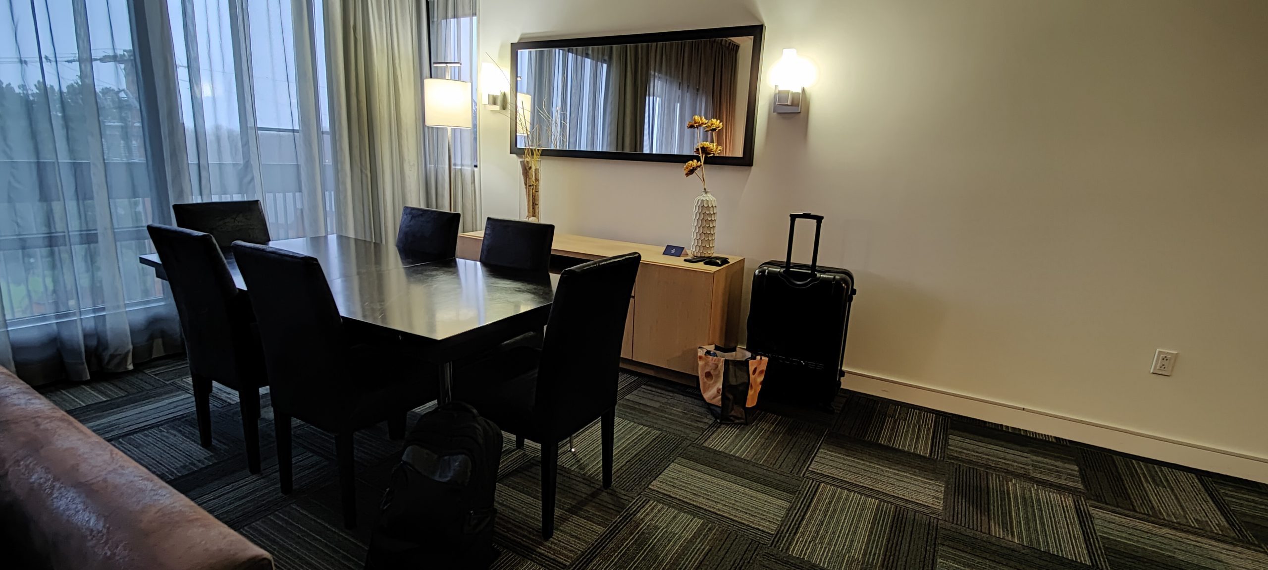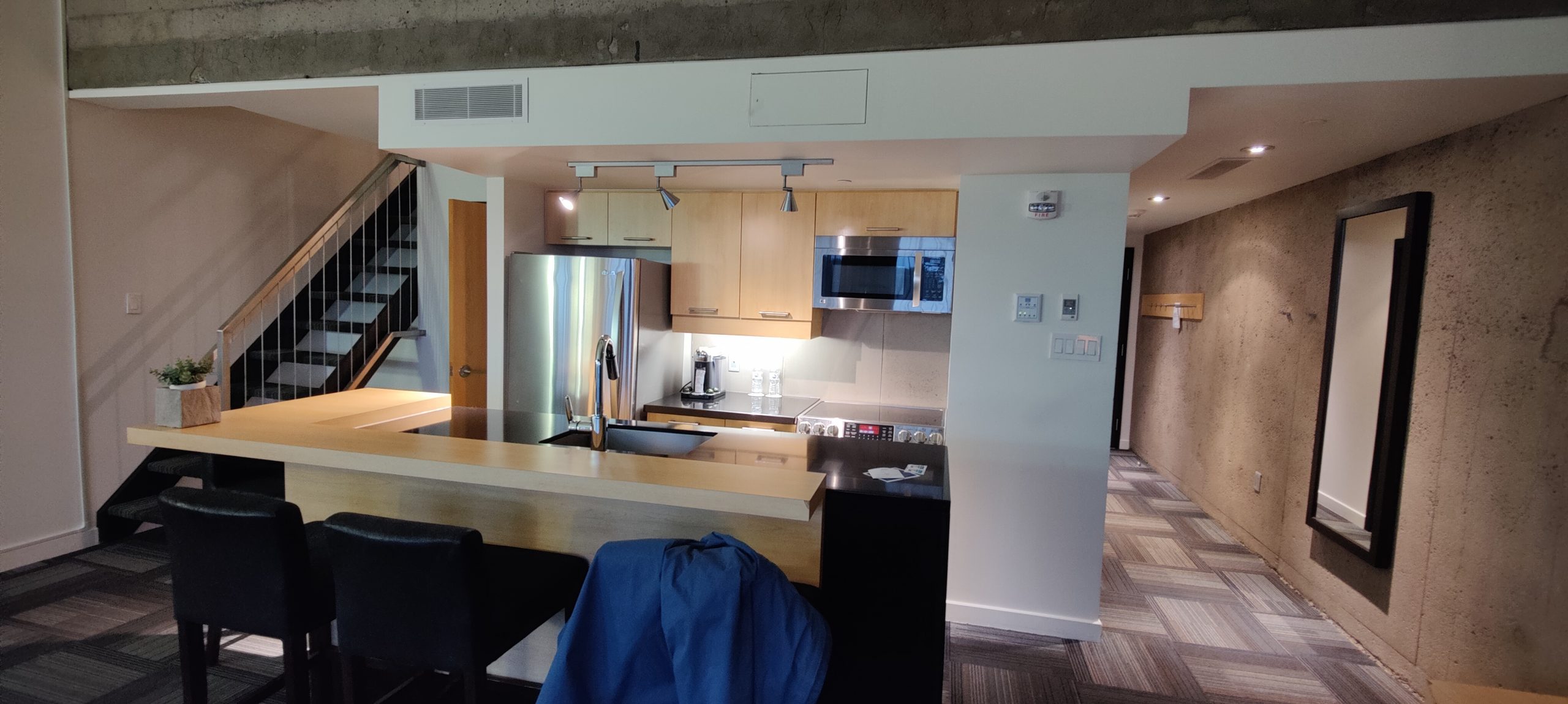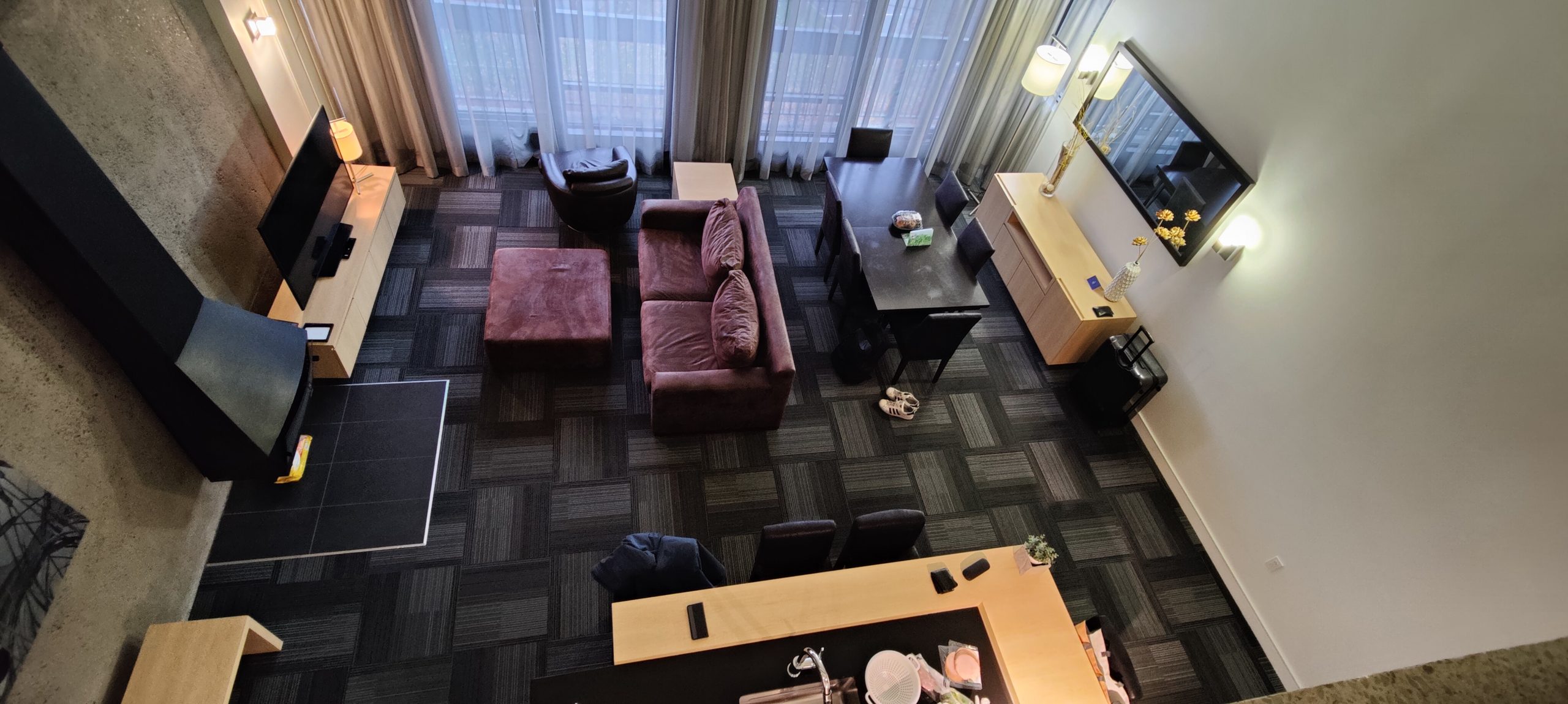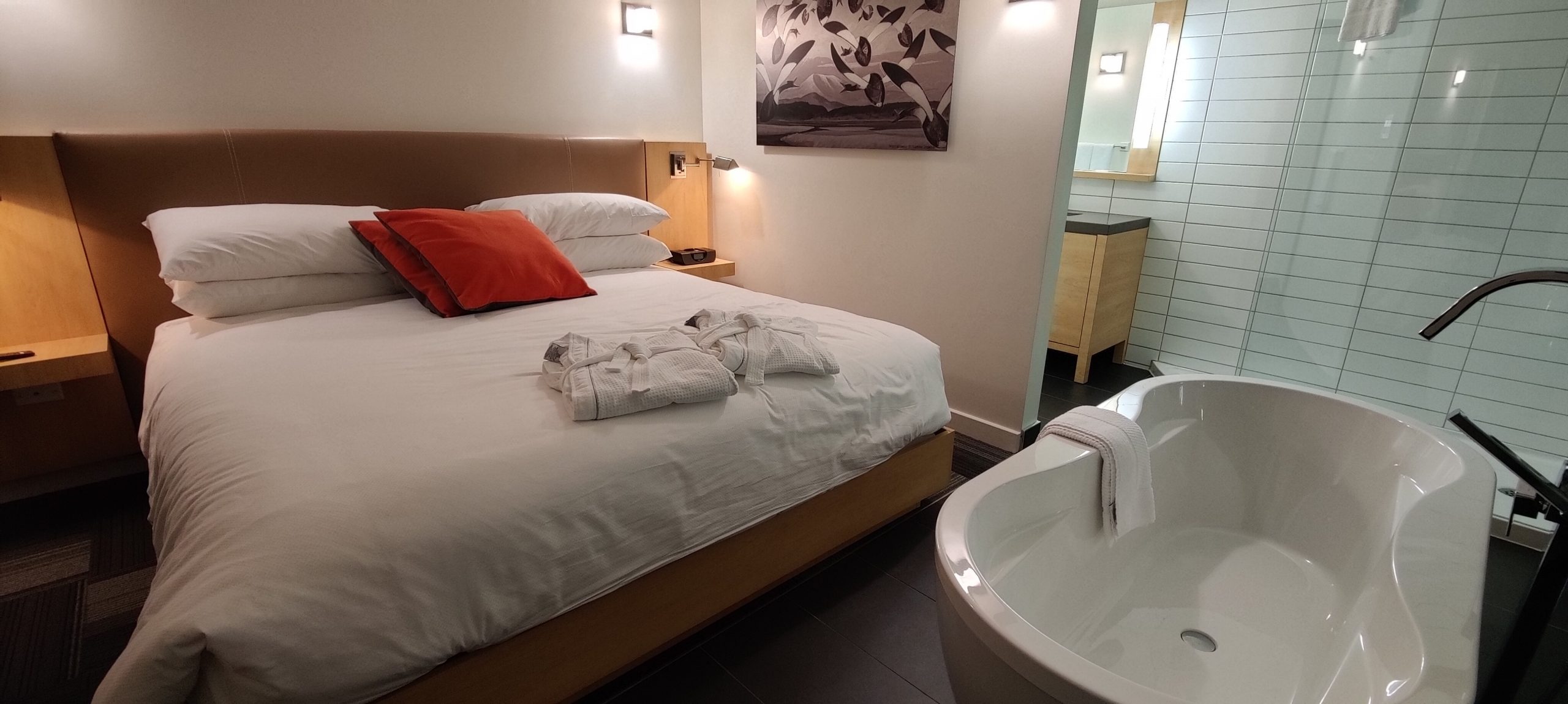 Initialement dans une chambre classique avec deux lits Queen, nous avons demandé un surclassement vers une suite. Nous avons eu l’énorme chance que l’hôtel n’était pas complet à cette période de l’année (la saison hivernale n’ayant pas encore commencée au moment de notre visite). Nous avons donc pu profiter d’un surclassement dans un penthouse.