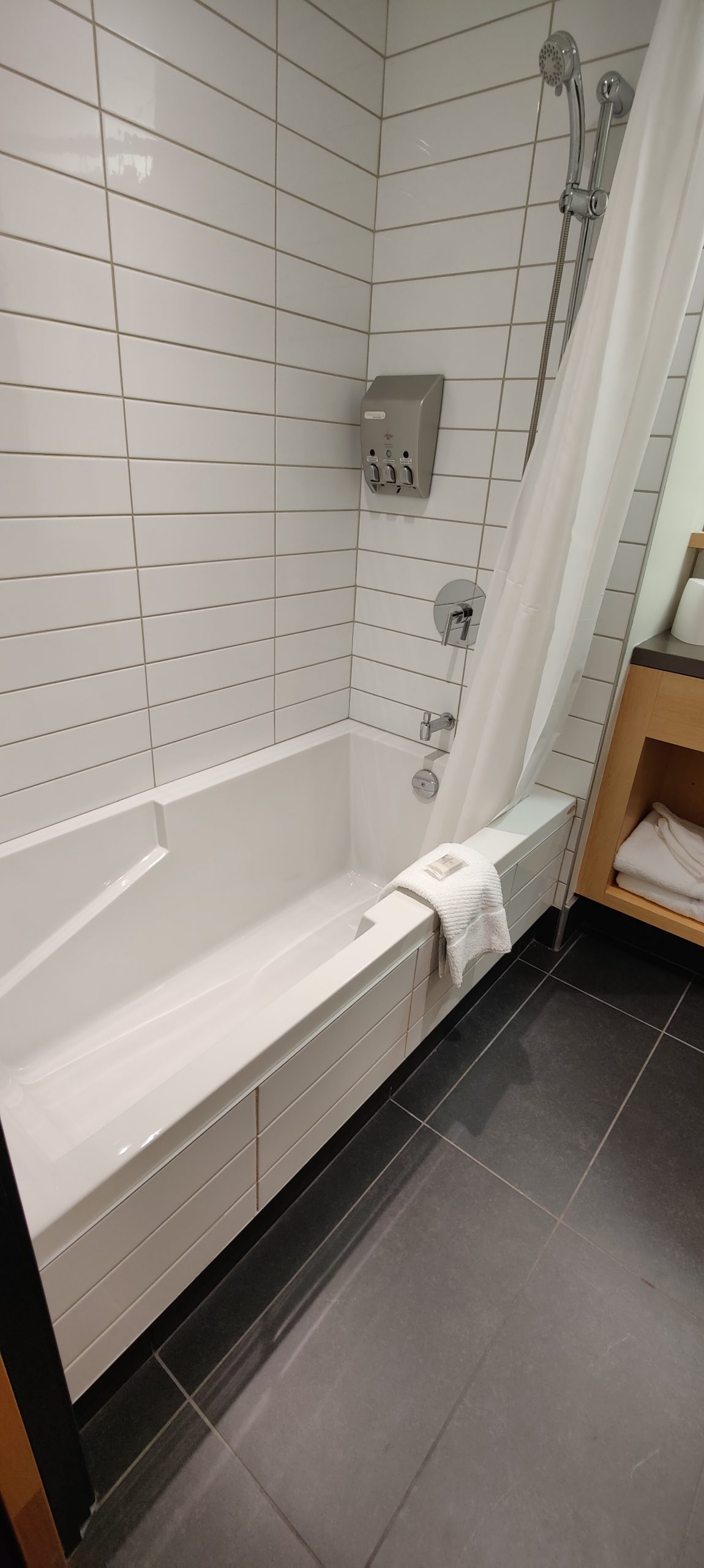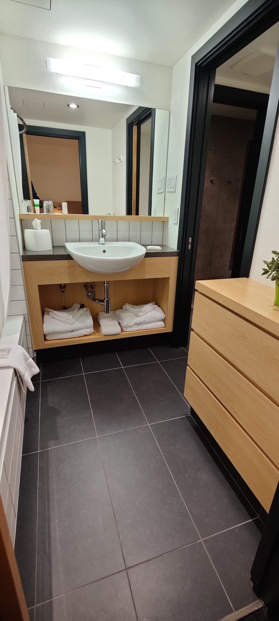 Concernant la salle de bain en elle-même, en plus de la présence de toilettes, se trouve une petite baignoire, d’un évier moderne et d’un mobilité de qualité. Nous avions droit à un grand nombre de serviettes. Il y a assez d’espace et même une petite commode pour y placer tous vos objets.